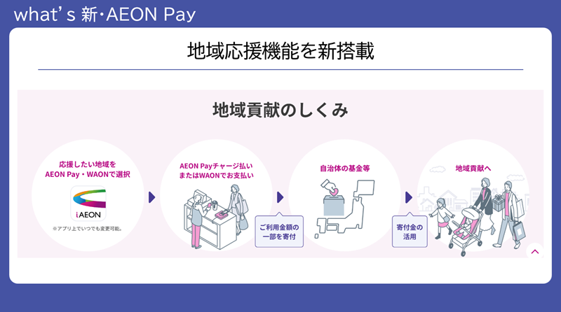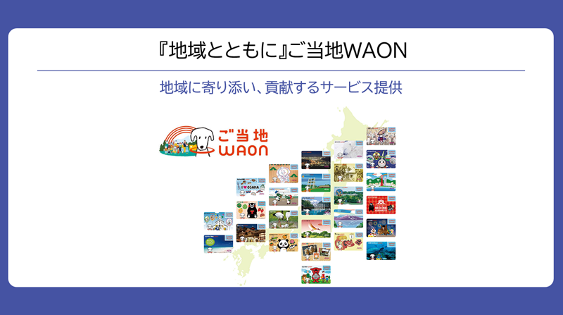 さらにこれを通じた地域貢献として、「ご当地WAON」の機能も搭載しました。利用金額の一部を自治体などに寄付して、地域経済の活性化や地域の環境保全などに役立てていただいています。