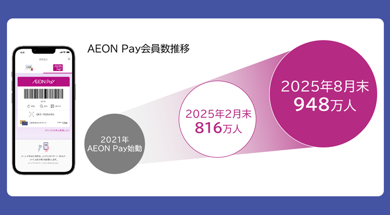 「AEON Pay」は2021年にイオンの新しいコード決済サービスとしてリリースいたしました。リリース後に送金機能やチャージ機能の搭載などのアップデートを繰り返し、会員数は着実に増え続けております。2025年8月末時点での会員数は948万人です。