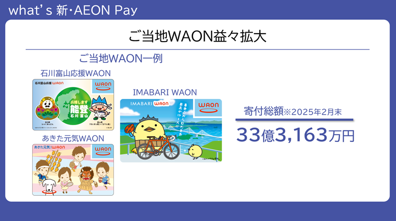 「ご当地WAON」の発行は、今もますます拡大しています。直近では11月10日に愛媛県今治市の「IMABARI WAON」の発行を開始しました。寄付総額は2025年2月末で33億3,163万円になりました。今後も「ご当地WAON」による地域貢献を続けていきたいと思っております。