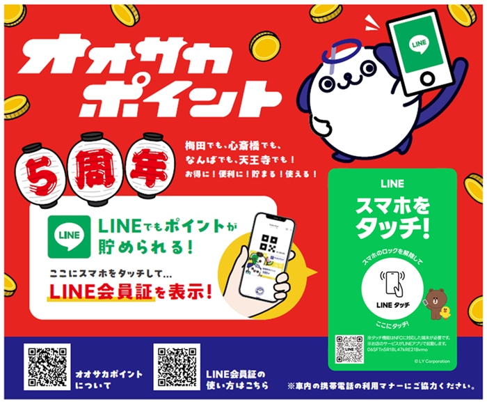 大阪市高速電気軌道(Osaka Metro)と大阪メトロアドエラは、Osaka PointのLINEの会員証の利用促進を目的に2026年1月9日から、駅構内や車内広告で「LINEタッチ」付き広告を掲出する。列車内にLINEタッチ機能を付与した広告を掲出するのは日本初だという。