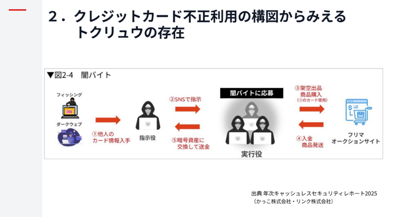 クレジットカードの不正利用の場合も、背後にトクリュウの存在があると指摘する。表面だけの対策では、解決することは難しく、トクリュウにメスを入れるなど総合的な対策が重要になるという。また、闇バイトの募集も、「簡単に稼げる仕事」だと思わせて、犯罪であることを巧妙に隠して、SNSなどの募集を通じて応募者を募っているという。