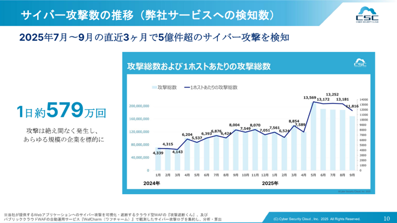 2025年の振り返りでは、サイバー攻撃による脅威・実被害ともに増加傾向にあることを紹介した。サイバー攻撃数の推移では、2025年7月から9月の3か月で5億件超のサーバー攻撃を検知(同社サービスへの検知数)した。1日約579万回で、攻撃は絶え間なく発生し、あらゆる規模の企業が標的になっている。