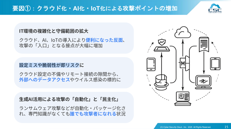 サーバー攻撃が増え続けている理由としては、「クラウド化・AI化・IoT化による攻撃ポイントの増加」がある。IT環境の複雑化や守備範囲の拡大により攻撃の「入口」となる接点が大幅に増加したほか、クラウド設定の不備やリモート接続のすき間から、外部へのデータアクセスやウイルス感染の標的になっている。生成AI活用による攻撃の「自由化」と「民主化」によって、専門知識がなくても攻撃者になれる状況がある。