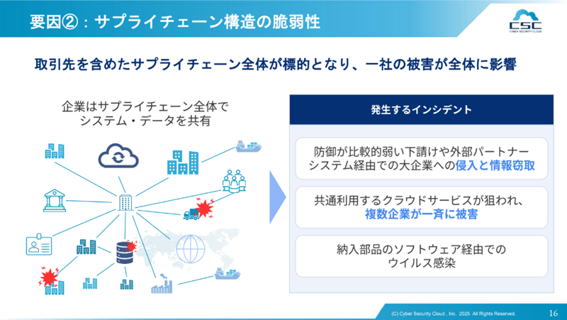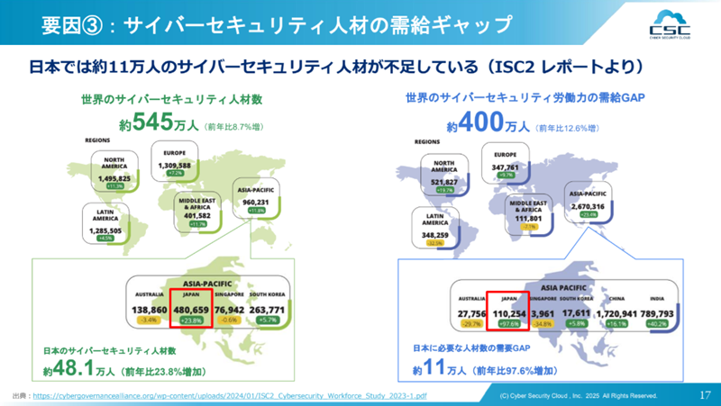 「サプライチェーン構造の脆弱性」により、取引先を含めたサプライチェーン全体が標的となり、1社の被害が全体に影響するようになっている。また、「サイバーセキュリティ人材の需給ギャップ」が大きく、日本では約11万人のサイバーセキュリティ人材が不足しているという。