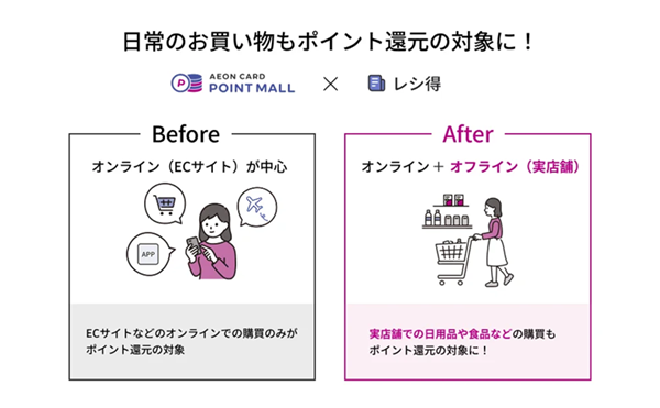 これまで「イオンカードポイントモール」では、主にECサイトなどのオンライン利用をポイント還元の対象としていたが、このほど「レシ得」を導入することで、近所のスーパーマーケットやドラッグストアなど「実店舗(オフライン)」での購買も新たにポイント還元の対象に加わる。