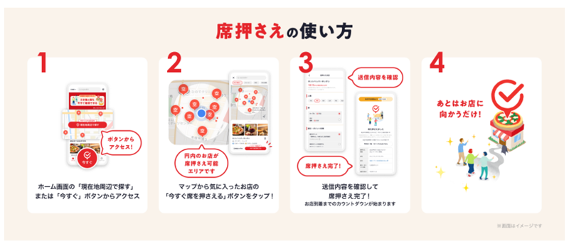 利用者はアプリを起動すると、ユーザーの現在地周辺にある飲食店がマップ上に表示される。このうち、現在空席がある店舗は“いますぐ入れる近くのお店” として地図上にピンで表示される。店舗から送信されるリアルタイムの席稼働データに基づき、ユーザーの検索条件で利用可能な空席状況が表示され、希望する店舗の席をアプリ上から直接確保できる。席の確保後も、利用開始時間の1分前までキャンセルが可能で、直前の予定変更にも対応できる。