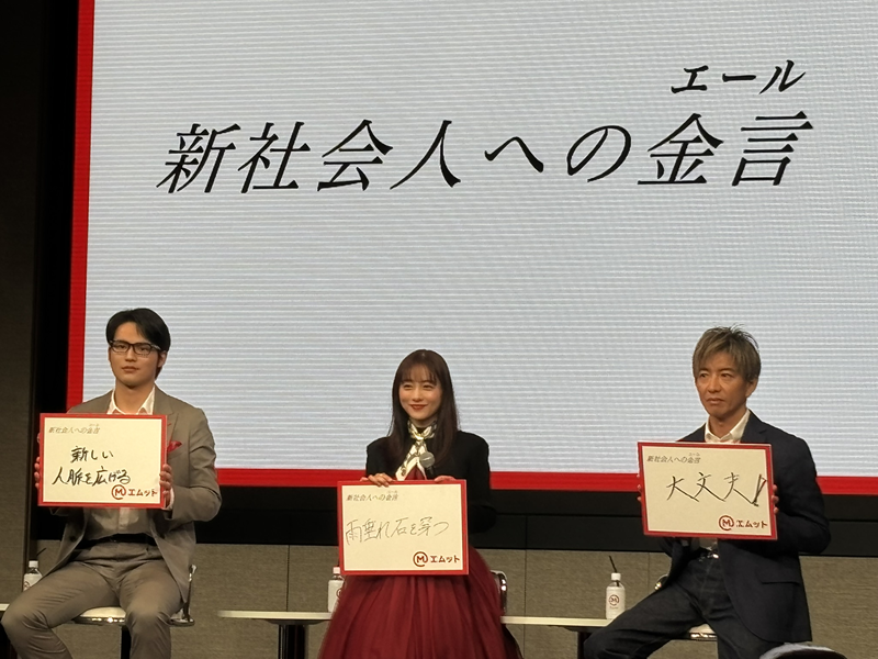 企画の最後には、新社会人に向けて、木村さんは「大丈夫!」、石原さんは「雨垂れ石を穿つ」、水上さんは「新しい人脈を広げる」と、それぞれエールを送った。