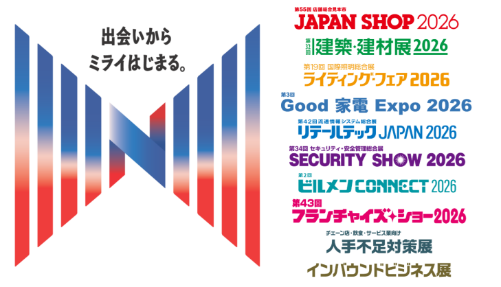 1972年の初開催から数えて50年以上の歴史を持つ日本有数の産業展示会で、今年はこれまでの「JAPAN SHOP」「建築・建材展」「ライティング・フェア」「Good 家電 Expo」「リテールテックJAPAN」「SECURITY SHOW」「ビルメン CONNECT」「フランチャイズ・ショー」に、初開催の「人手不足対策展」「インバウンドビジネス展」を加えた10の展示会で構成します。全体の開催規模は2026年1月28日現在、1,101社・団体、3,077小間にのぼる。