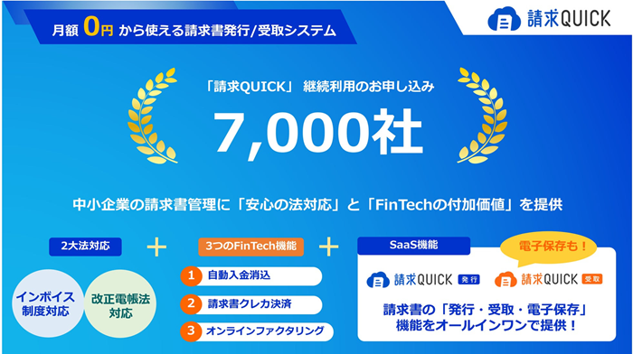 「請求QUICK」は中小企業にとって価格面・機能面ともに使いやすく、導入ハードルの低いツールを目指し、サービス提供を行ってきたという。顧客利便性を第一に考え、法対応、請求書の発行/受取機能や、クレジットカード決済機能「クレカQUICK」の継続課金機能、また売掛金を早期資金化できるオンラインファクタリング「入金QUICK」を搭載し、機能向上に努めてきたという。こうした中小企業の課題に寄り添ったサービス体系が評価され、7,000社を超える企業から継続利用の申し込みをもらっていた。