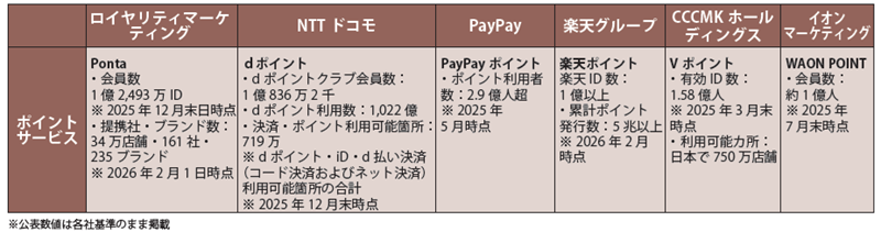 ポイントサービス分野も注目だ。国内では「Vポイント」「dポイント」「Pontaポイント」「PayPayポイント」「楽天ポイント」といった数千万~億単位の会員基盤を持つ共通ポイントサービスが展開されている(図6)。