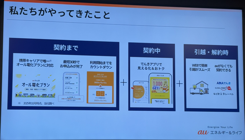 同社では、携帯キャリアで唯一、オール電化プランに対応。また、最短30秒での申し込みに短縮したり、利用開始までのカウントダウンを表示できるようにした。契約中はでんきアプリで見える化したり、ガチャでお得を提供している。引っ越し時にはWebからか簡易に手続き可能だ。さらに、ANAユーザーに対しての「ANAでんき」、三菱UFJニコスの「グローバルポイントでんき」など計19レーベルと連携することで、au以外のサービスを利用する人にも対応できるようにした。