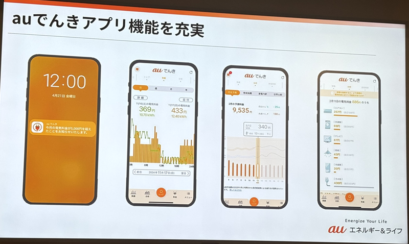 auでんきアプリ機能は、30分単位の電気使用量をグラフで可視化したり、料金を見える化している。さらに、日々の使用状況から月末の電気料金を予測・表示する「月末予測」の精度向上、Pontaポイントが当たるでんきガチャなどの「お楽しみ機能」といった改善が進んでいる。
