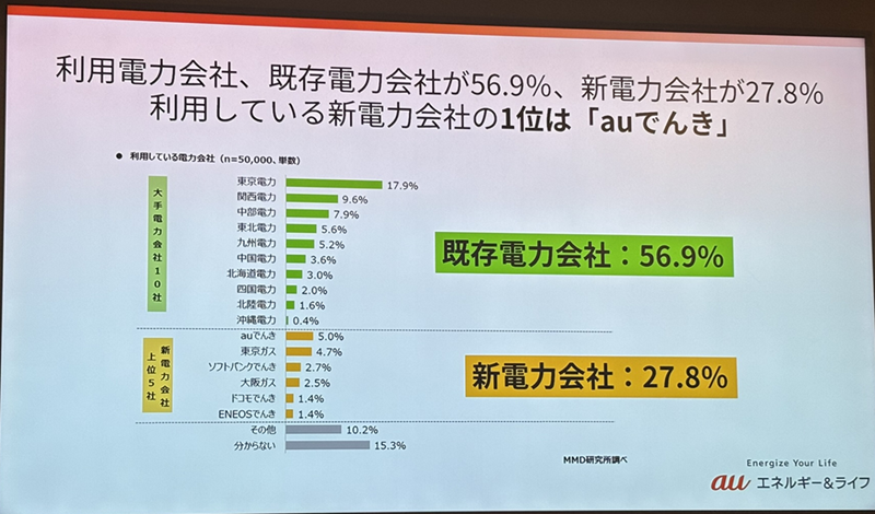 利用電力会社は、既存電力会社が56.9%、新電力会社が27.8%となっている。利用している新電力会社の1位はauでんきだ。