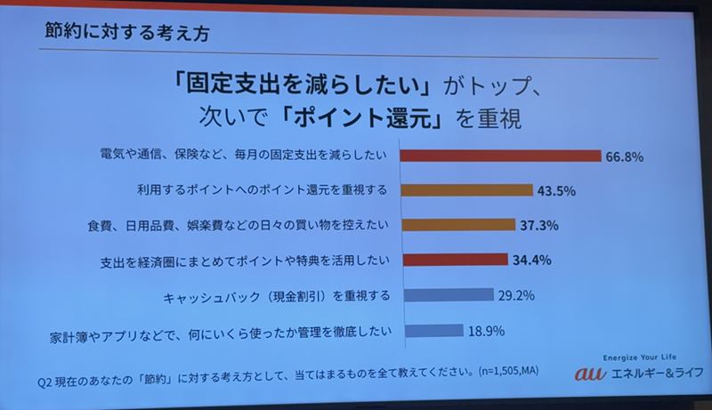 auでんきを使っている人の約9割は節約を意識している。また、節約意識への考えとして、固定支出を減らしたいがトップで、次いでポイント還元を重視している。生活インフラの節約優先度は電気料金がトップで、次いでスマホ料金となった。