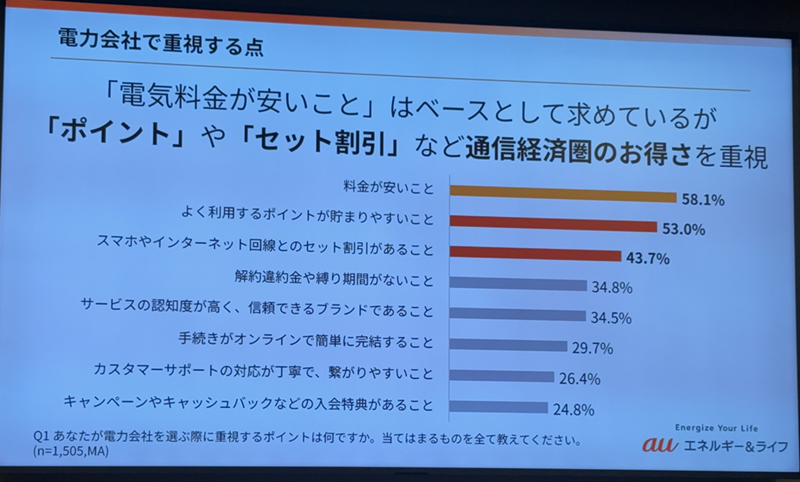 電力会社で重視する点は、電気料金が安いことがトップで、次いで「よく利用するポイントが貯まりやすいこと」「スマホやインターネット回線とのセット料金があること」が続いた。吉本氏はポイントやセット割りなど、通信経済圏のお得さを重視しているとした。