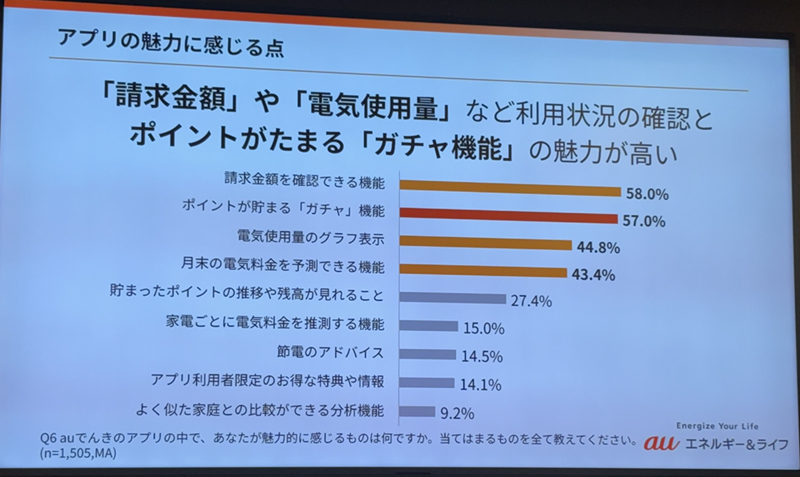 auでんきアプリの活用実態として、利用者の96.5%がauでんきアプリを利用している。アプリに魅力を感じる点は、請求金額や電気使用量など、利用状況の確認とポイントが貯まる「ガチャ機能」の魅力が高いそうだ。