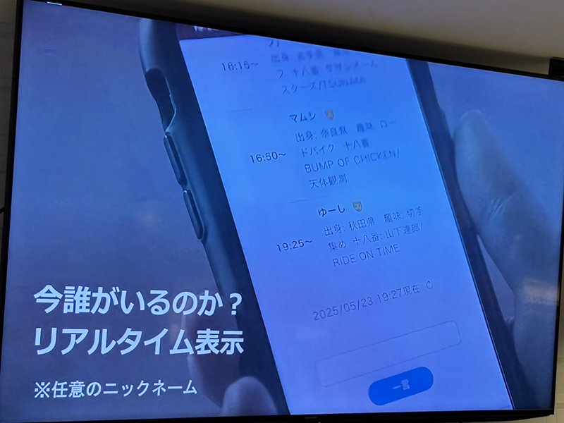 スナテクの具体的なサービスの特徴として、現在来店中のユーザー(ニックネーム、趣味など)や来店予定がリアルタイムで可視化できる。