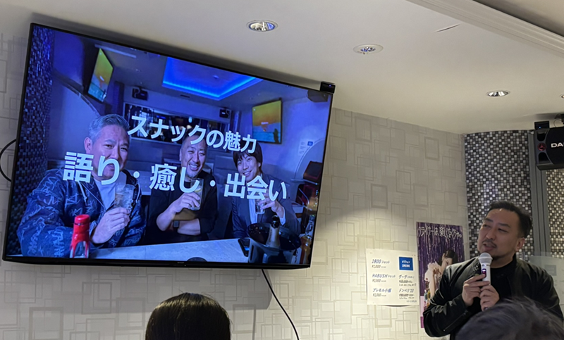 当日は、スナック業界の現状や課題、可能性などを紹介するとともに、「スナテク」の魅力について関谷氏が紹介した。また、2019年11月よりオープンし、スナック激戦地と言われる東京・新橋でトップクラスの人気を誇るとされる「BAR BRIDGE」の吉田早織ママと、ママ個人のSNS総フォロワー数が約10万人(Instagramフォロワー3.8万人、TikTokフォロワー6万1400人)を有する山形県「Lounge eagle.」より、伊藤なつみママをゲストに迎え、代表の関谷とスナックに関するトークを繰り広げた