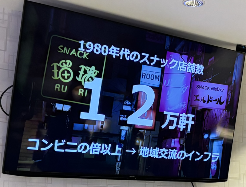 スナックは語りや癒し、出会いの場であり、1980年代は12万軒存在すると言われていた。