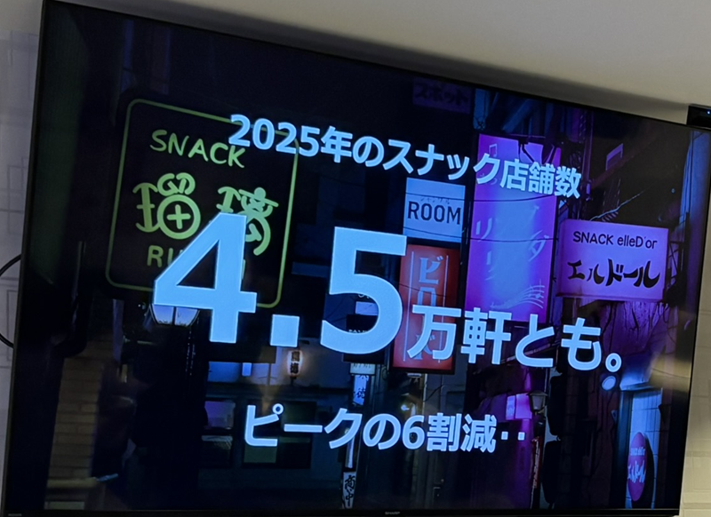 地域交流の場として全国津々浦々にスナックは存在していたが、現在はピークの6割減となり、4万5,000万軒ほどの数となっている。それでも、コンビニエンスストアに匹敵するほどの数があるとみている。