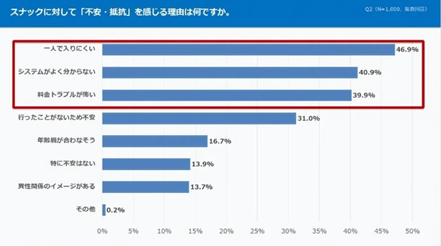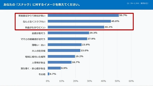 同社では、全国の飲酒習慣がある20〜69歳の男女1,000名を対象に「スナックに関する意識調査」をインターネット調査で実施した。スナックに対するイメージとして、50.7%が「常連客ばかりで敷居が高い」と回答した。また、45.0%が「なんとなく入りづらい」、40.2%が「料金がわかりにくい」としている。