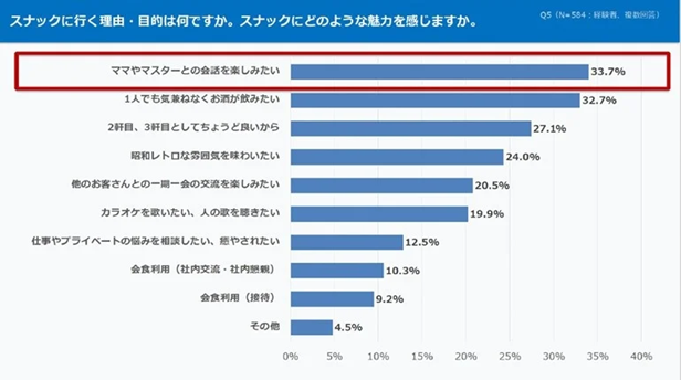 逆に、スナック経験者にスナックに行く理由・目的を聞いてみると、1位は「ママやマスターとの会話を楽しみたい」で、33.7%となった。