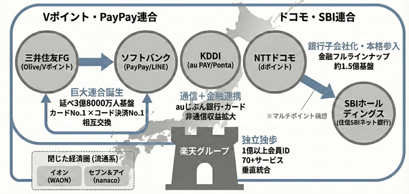 第二が、通信キャリア発の経済圏だ。ドコモは住信SBIネット銀行の買収で金融のフルラインナップを整え、KDDIはauじぶん銀行やau PAYカードを擁して非通信収益を伸ばす。ソフトバンク陣営はPayPayとLINEを統合し、コード決済で圧倒的なシェアを握った。