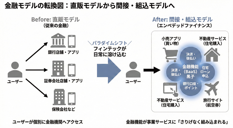 それが今、「間接モデル」へと転換しつつある。一般の事業者に金融機能が組み込まれ、ユーザーの日常生活、日常業務の中で金融フィンテックを使うことができるという世界だ。買い物をするアプリの中に決済や後払いの機能があり、住宅を購入すれば住宅ローンの申し込みまでワンストップで完結する。金融サービスが「さりげなく組み込まれている」からこそ、意識せずに使える世界が広がっている。