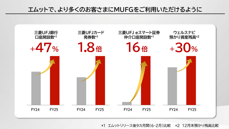 具体的には、前年同期比で、三菱UFJ銀行の口座開設数は約47%増加、クレジットカード「三菱UFJカード」の発券数は約1.8倍となった。また、昨年完全子会社化した三菱eスマート証券の仲介口座開設数は16倍、ウェルスナビの預かり資産残高は+30%となっている。これらの成果は、エムットの大きな前進であり、今後の進化に向けた強力な基盤となるそうだ。