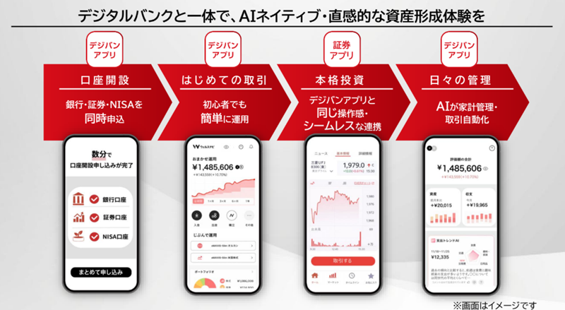 新サービスはデジタルバンクのアプリと一体のUI/UXによって、銀行、証券の垣根を感じることのないシームレスな顧客体験を提供する。2026年度は、国内株式取引手数料の無料化。中間持株会社により資産形成がさらにお得になる。さらに、デジタルバンクのアプリでMAP AIがアドバイスする。利用者のデータを把握、分析したAIが一人一人に合った提案を行うことで、まるで自分専属のアドバイザーとして24時間、365日場伴走する体験を提供する。2027年度には新エンティティ設立で、デジタルバンクと一体となり、さらに便利なサービスを提供していく。