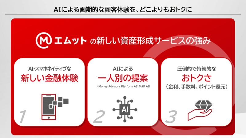 三菱UFJ銀行では、幅広い利用者に新しい資産形成サービスを体験してもらうため、MUFGのグループ傘下にある三菱UFJ eスマート証券とウェルスナビを統合し、新エンティティを立ち上げる。新エンティティでは、エムットの中核サービスとして、新しいデジタル資産形成サービスを提供する予定だ。来年度の開業に向けて、準備中のデジタルバンクと一体で、AIネイティブ・直感的な資産形成体験を提供するそうだ。
