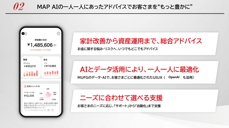 MAP AIによるアドバイスでは、日々の家計管理やその改善、NISAによる資産形成まで総合的にアドバイスする。MAP AIは、MUFGのもつ取引データや家計関連のデータを総合的に活用するほか、AIを活用することで、利用者の状況やライフステージを把握し、使うごとにパーソナライズされていく。