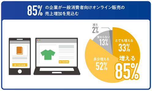 一般消費者向けオンライン販売を行う法人を対象とした調査では、今後EC売上が増加すると考えている企業は85%にのぼった。「とても増えると思う」(33%)と「多少増えると思う」(52%)を合わせ、多くの企業がEC市場の成長を見込んでいるそうだ。同傾向は、企業規模が大きくなるにつれ、強くなっている。