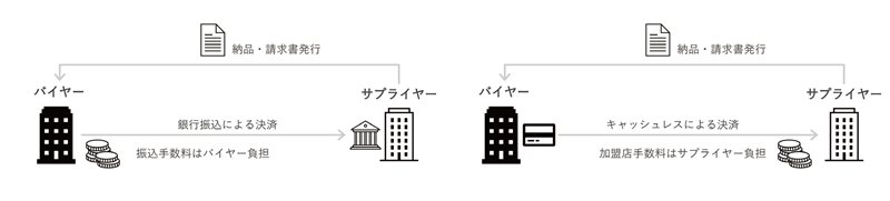 請求代行サービスがサプライヤー側に立つのに対し、バイヤー側に立つのが請求書カード払いだ。これは、事業性取引のメリットの多くがバイヤー側に寄る一方で、手数料負担を嫌うサプライヤーといった状況の中、キャッシュレスで支払いたいバイヤーと銀行振込で受け取りたいサプライヤーとの間を繋ぐサービスだ。バイヤーは、サプライヤーから受け取った請求書に基づき、仲介事業者に対し、支払い金額をキャッシュレスで決済する。これを受け、仲介事業者はサプライヤーに対し、バイヤー名義で銀行振込を行う。手数料はバイヤー側で負担するが、手数料負担以上のメリットがバイヤーに認められ、近年、その利用が増加している。
