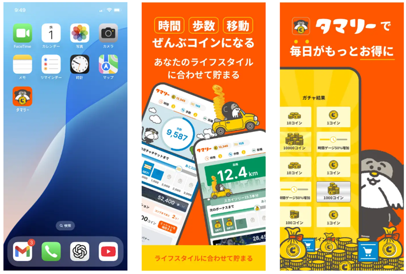 アプリ「タマリー」では、時間経過(待つだけ/アプリを起動しなくても貯まる)、歩 数(歩くだけ/毎日の歩数がそのままコインになる)、移動距離(移動だけ/移動した距離に応じてコインが貯まる)、動画視聴でコインが貯まる。