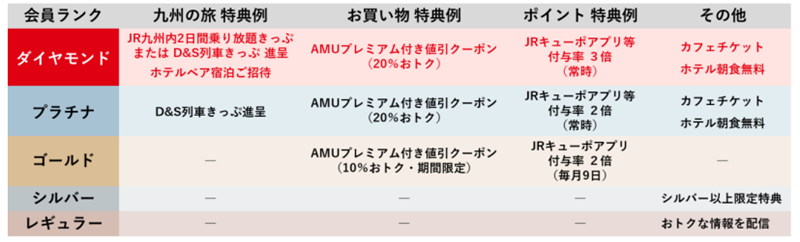 会員ランクは、利用状況に応じて、レギュラー・シルバー・ゴールド・プラチナ・ダイヤモンドの5つのランクを設定している。判定期間は、毎年4月1日~翌年3月31日の1年間。また、適用期間は翌年度1年間となる。