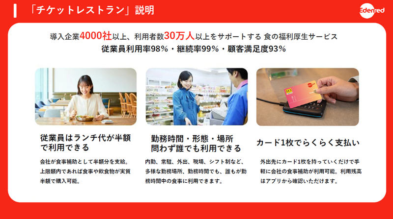 エデンレッドジャパンは、2026年3月30日、「食事補助非課税枠拡大に向けた連携発表会」を開催した。同社では、福利厚生サービス拡大に向けて、ベネフィット・ワン、イーウェルと戦略的提携を強化する。また、松屋フーズホールディングスや吉野家などとお得なクーポンがチケットレストラン公式アプリを通じて利用できる新サービスを開始。さらに、食事補助の適正運用を支援するため、AIによるレシート解析機能「証憑スキャン」もできるようにした。