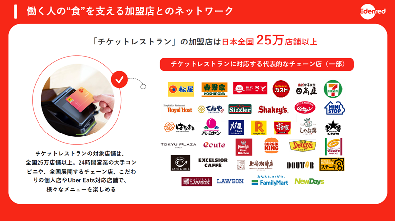 日本全国25万店の加盟店に、働く人々の食生活をサポートしてもらっている。松屋、吉野家などの飲食チェーン、コンビニエンストア、個人飲食店、そして、デリバリー最大手のUberとも提携している。
