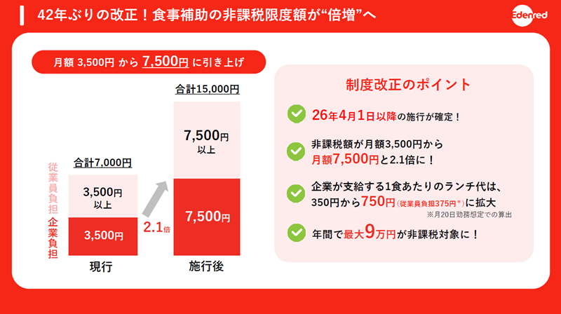 同社では、従業員・企業・飲食店の「三方よし」を実現し、日本全体への経済波及効果をもたらすことが使命だという。これまで、非課税食事補助の手取りアップ効果に着目し、限度額拡大を政府に提言してきたが、食事支給に係る所得税非課税上限を月額3,500円から7,500円へ引き上げる制度改正について、国税庁より通達改正の公表が行われ、2026年4月1日に施行された。天野氏は「この改正は、大変大きなインパクトをもたらすものであるというふうに、我々考えております」と話す。月20日勤務の人で算出した場合、企業が支給する1食あたりのランチ代は、350円から750円(従業員負担375円)に拡大する。年間で最大9万円が非課税対象になるという。