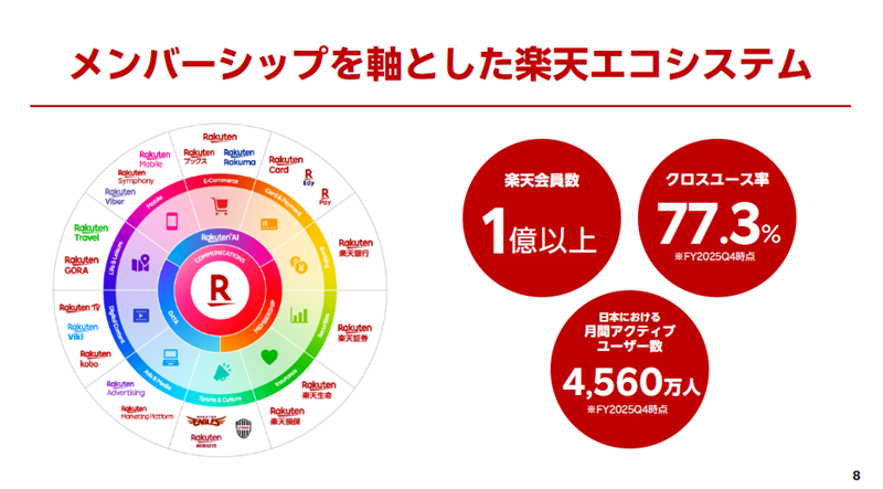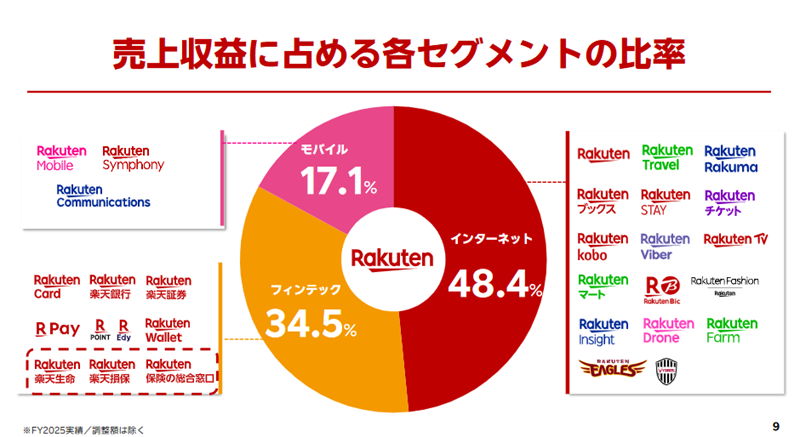 楽天は2003年に証券事業、2005年にクレジット事業に参入。2009年にインターネット銀行事業に参入した。保険では、2012年に生命保険事業、2018年に損害保険事業に参入している。フィンテックセグメントの直近の実績をみると。楽天カードは、取り扱い残高が26.5兆のショッピング取扱高、発行枚数3,400万枚となった。楽天銀行は、2026年3月に1,800万口座を突破し、単体預金口座は13.2兆となった。楽天証券の総合口座数は1,326万口座、NISAは700万口座を達成した。預かり証券については48.7兆と、大手証券会社に迫っている。