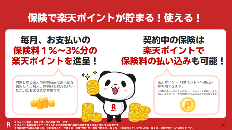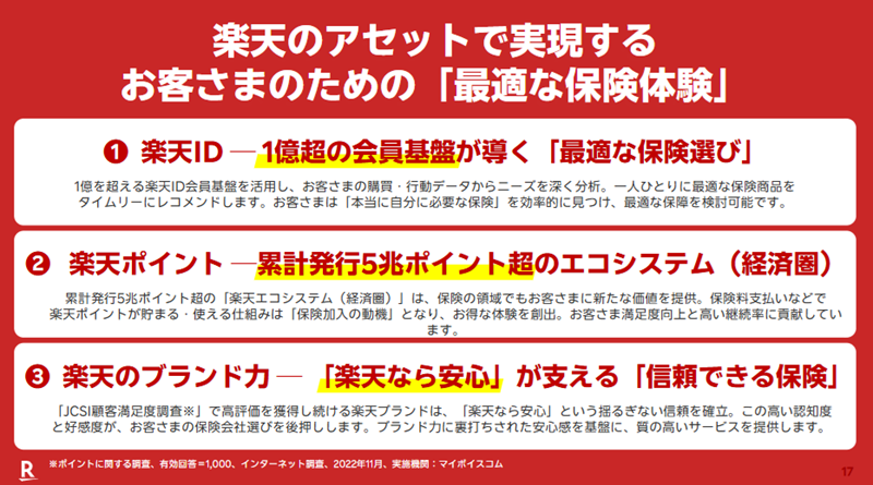 楽天エコシステムを活用した保険事業の競争優位性として、会員基盤・楽天ポイント・楽天ブランドの活用が挙げられる。楽天のアセットを保険のマーケティングにも同様に活用している。楽天IDとそれに紐づくデータにより、購買、行動データはもちろん、利用者の同意を得たうえで利用者に適切なタイミングで、適切な商品をパーソナライズして一人一人に違うメッセージで配信している。また、累計5兆ポイントを発行する楽天ポイントも活用し、継続的にポイントを付与することによって、顧客満足度の向上、高い継続率につながっている。さらに、楽天のブランド力を活用した取り組みも実施。「楽天なら安心」が支える「信頼できる保険」を提供している。また、楽天のネーミング活用によって、お得なイメージを植え付けている。