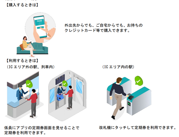 利用者は、駅の券売機や窓口まで行くことなく、自宅等でアプリから定期券を購入できる。また、ICエリア外の駅同士や、IC エリア内外にまたがる区間の定期券を購入できる。さらに、ICエリア外の場合は、駅や列車内で係員にアプリの定期券画面を見せることで、定期券を利用可能だ。