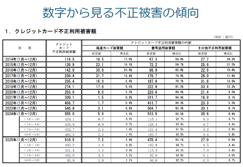 けれどもその後、被害額は増えて、2025年には1-3月期だけで被害額は優に100億円を超えています。単純に2016年の4倍になったということです。この間にキャッシュレス化が推進されて、カード決済の単価は大幅に下がっているので、件数で考えれば4倍では済まない。8倍から10倍ぐらいの件数が被害に遭っているということです。