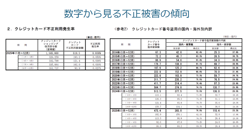 先ほど、カード会社の報告と言いましたが、つまりこれは、イシュアが報告した数字です。加盟店側の実感とは乖離があるように思います。そしてここには国外発行のカードによる被害は含まれていません。加盟店からすれば、不正が国内発行のカードで起きたのか国外発行のカードかということは関係ありません。ですがこの数字はあくまで国内のイシュアの数字で、国内発行分だけが対象だということです。