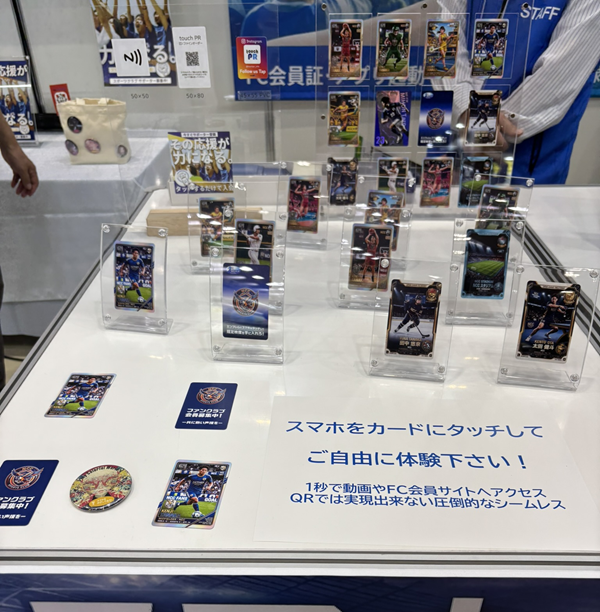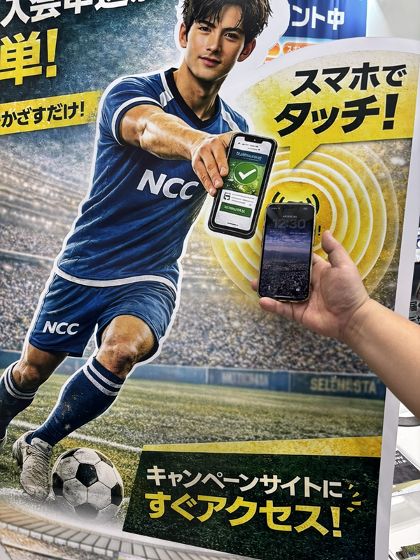 また、看板やカードにNRFタグを埋め込み、利用者のスマートフォンでタッチするとWebサイトに誘導するソリューションのデモを実施した。スタジアムなどでは決済アプリへの遷移など、レジ混雑にも活用できるとした。