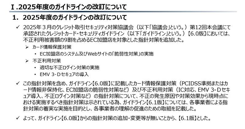 まず、昨年2025年3月に改訂したガイドライン【6.0版】については、不正利用被害額の9割を占めるEC加盟店を対象とした指針対策を追加いたしました。カード情報保護対策では、EC加盟店のシステムおよびWebサイトの改ざんやウイルス感染による情報漏えいを防ぐために、脆弱性対策の実施を追加しました。さらに不正利用対策においては、本人になりすましてログインを行い、不正利用を行う手口への対策として、適切な不正ログイン対策の実施、それから利用時に本人になりすまして不正利用を行う手口への対策としてEMV 3-Dセキュアの導入を追加いたしました。