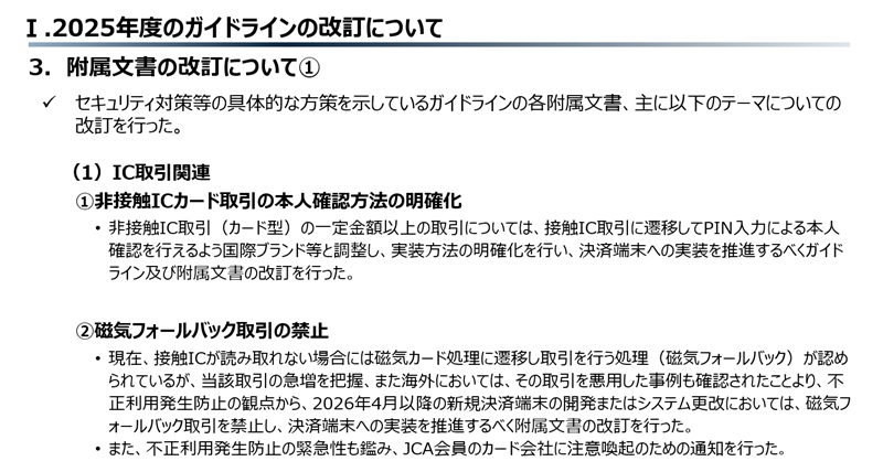 そこで、不正利用発生防止の観点から、2026年4月以降の新規決済端末の開発またはシステム更改においては磁気フォールバック取引を禁止することを国際ブランド、カード会社と合意し、これに伴って附属文書も改訂しました。また、不正利用発生防止の緊急性を考慮して、JCA会員のカード会社に注意喚起のための通知を行いました。特に加盟店の皆様においては、セルフレジ、セミセルフレジにおける注意と、イシュアの皆様には、磁気ストライプのオーソリについて注意をしていただくようにお願いいたします。