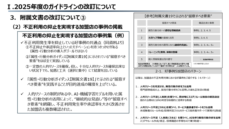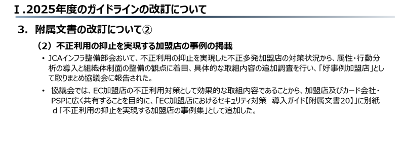 3点目は、EC取引における不正利用抑止を実現した加盟店の事例の掲載です。JCAのインフラ整備部会では、非対面の不正利用対策について、ガイドライン記載の基準等の検証及び不正利用被害防止の決済の調査・検証を行っています。2025年度の活動では不正多発加盟店いわゆる不正顕在化加盟店において不正利用の抑止を実現した加盟店の対策状況の分析を行いました。その結果、不正の抑止には組織体制の整備を伴った属性・行動分析の活用が有効であることが明らかになったため、具体的な取り組みについて追加調査を行い、この結果を「好事例加盟店」として取りまとめ、当協議会に報告されました。