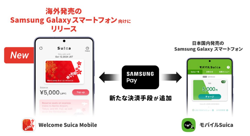 2027年以降に海外で発売される「Samsung Galaxyスマートフォン」において、訪日旅行者向けのSuicaアプリケーション「Welcome Suica Mobile」でのSuica発行に対応する。発売地域や対応機種は、今後詳細が決まり次第、公表するという。
