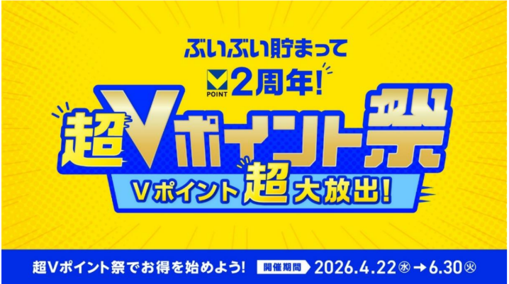 Vポイントマーケティングと三井住友カードは、共通ポイントサービス「Vポイント」の2周年を記念し、2026年4月22日~6月30日までの間、Vポイントを軸とした大型キャンペーン 「超Vポイント祭」 を開催している。